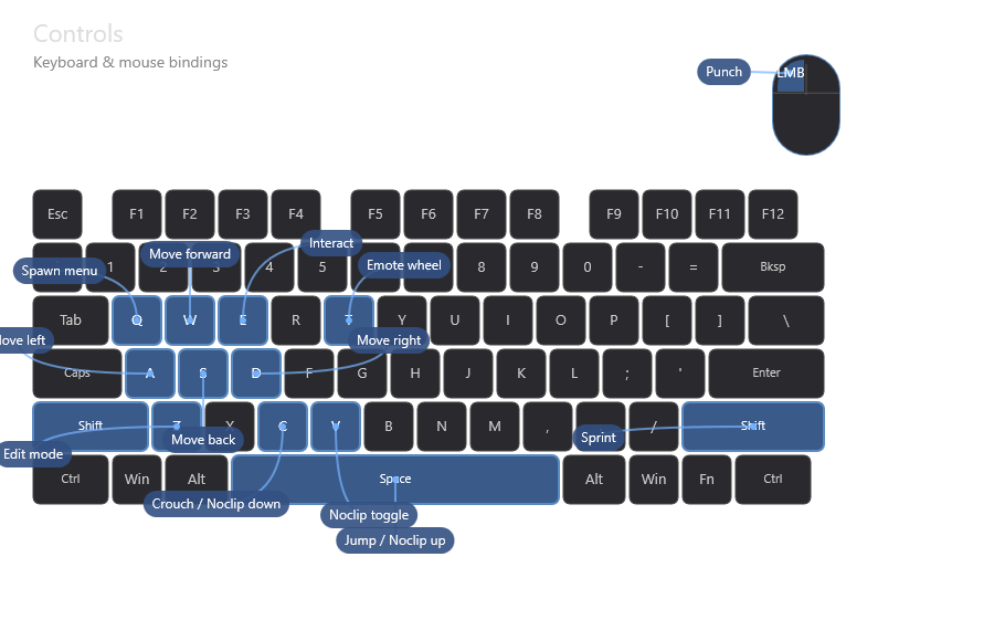 Movement Sprint, crouch, emote, and noclip fly mode for getting around. Undo and clear tools let you experiment without worrying about cleaning up.